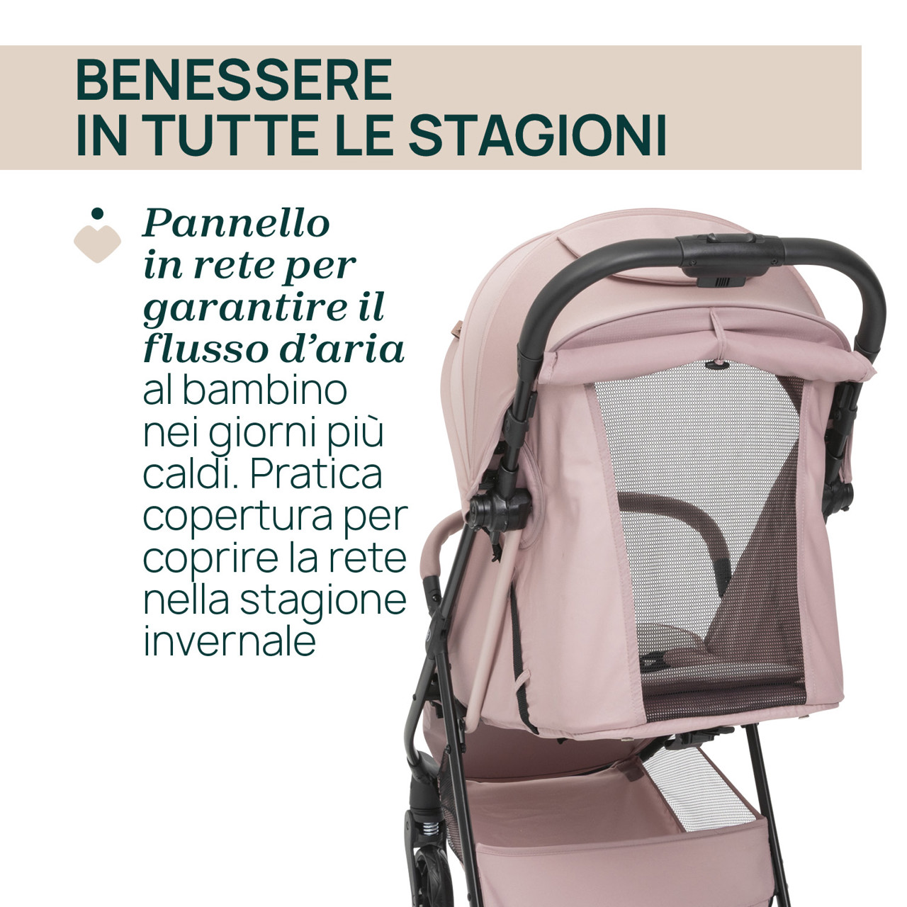 • Ottima circolazione dell'aria grazie al pannello in rete sullo schienale, per mantenere il bambino fresco durante l'estate.