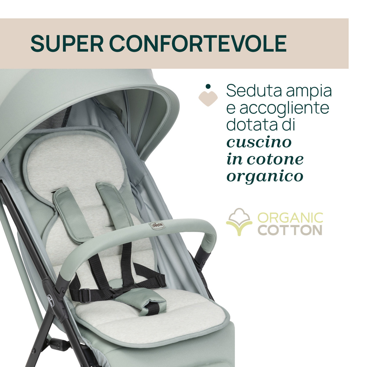 • Il passeggino Taormina è dotato di uno speciale cuscino soft touch in cotone biologico per aumentare il comfort del bambino. È morbidissimo e delicato sulla sua pelle.