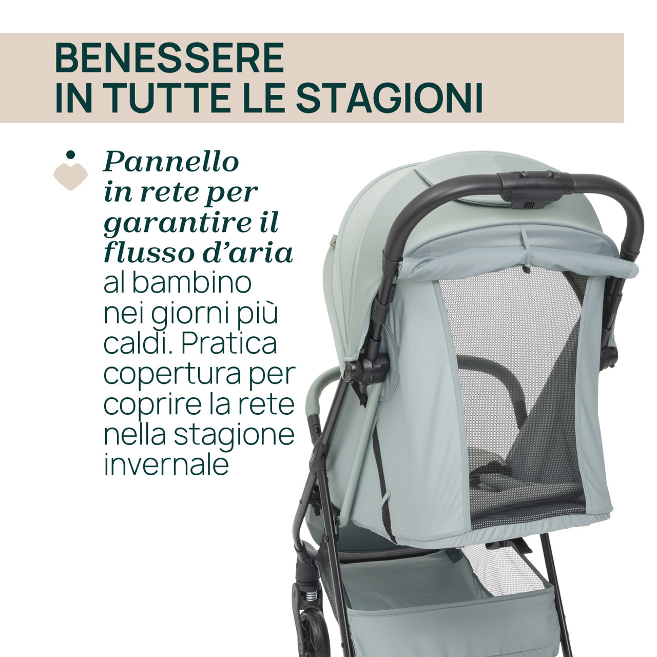 • Ottima circolazione dell'aria grazie al pannello in rete sullo schienale, per mantenere il bambino fresco durante l'estate.