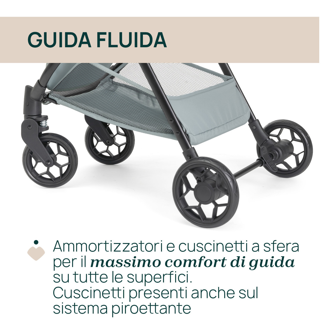 • Facile da guidare e comodo su ogni terreno: ammortizzatori su tutte le ruote e cuscinetti a sfera sulle posteiori e sul sistema piroettante. Genitori e bambini si godranno ogni passeggiata