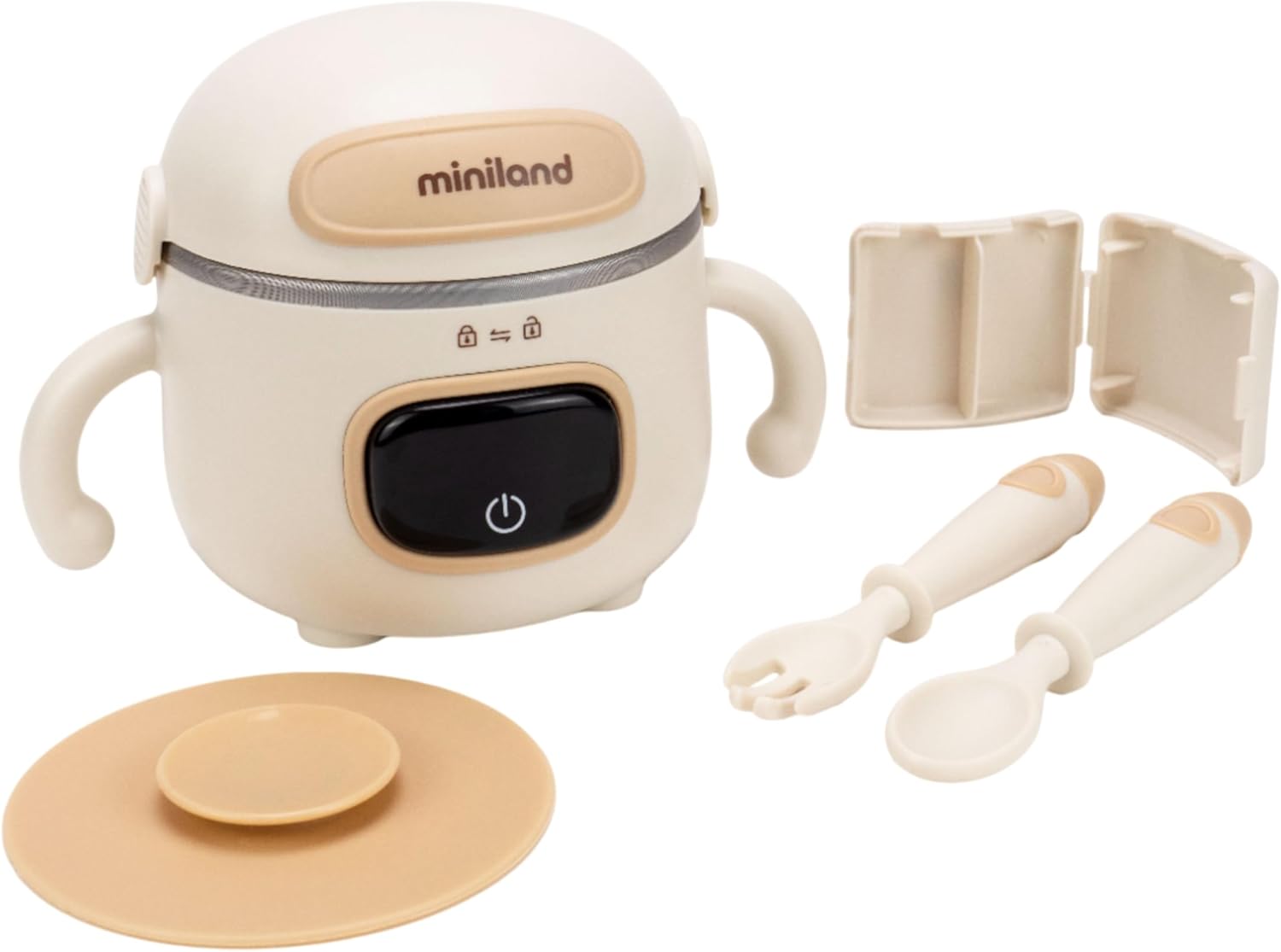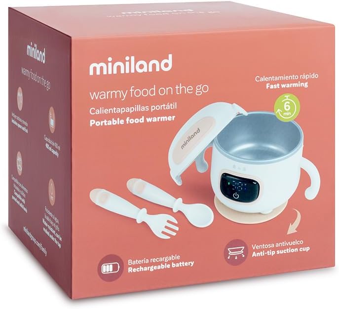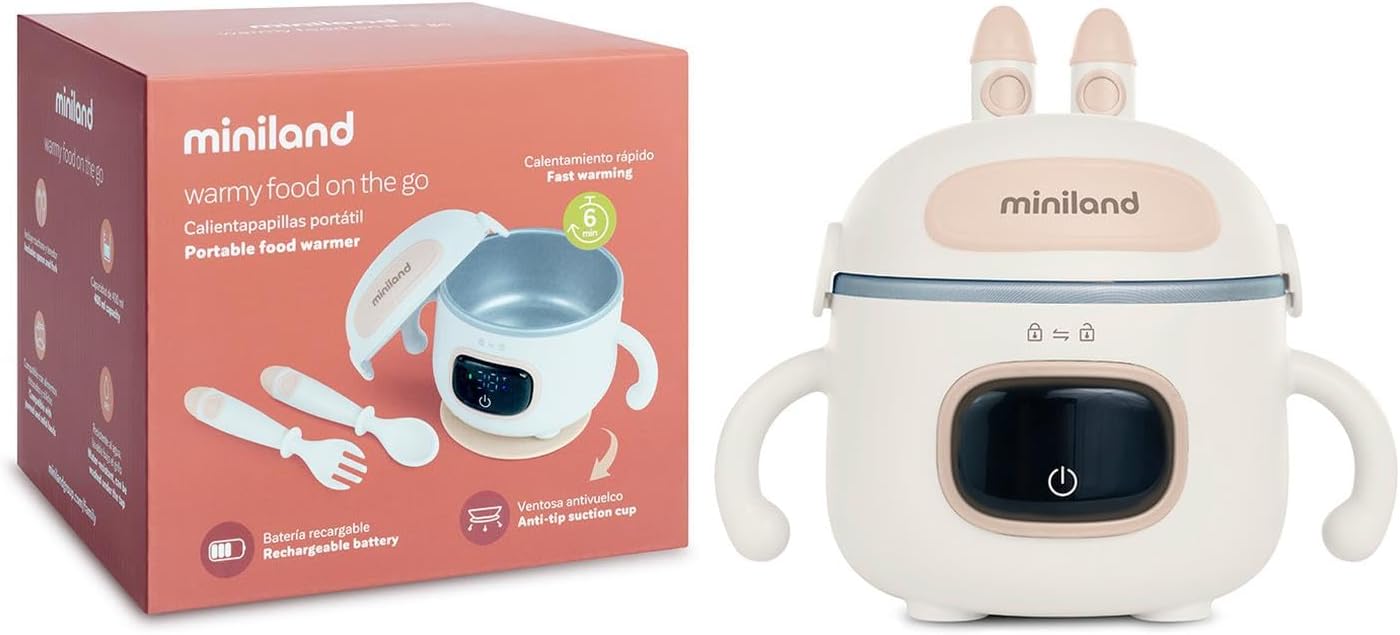Miniland scaldapappa Portatile Senza Fili 7500mAh, Scalda Pappa Portatile Neonato da Viaggio e Scaldavivande a Batteria, Kit Svezzamento con Posate,