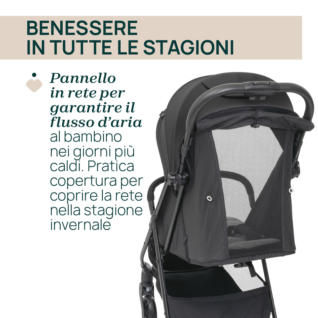- Ottima circolazione dell'aria grazie al pannello in rete sullo schienale, per mantenere il bambino fresco durante l'estate.
