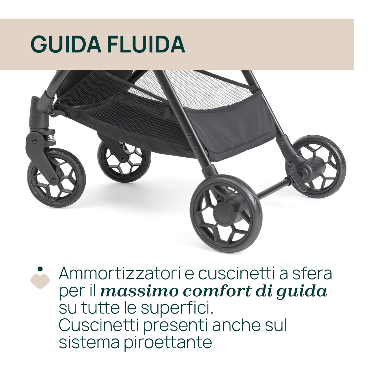 - Facile da guidare e comodo su ogni terreno: ammortizzatori su tutte le ruote e cuscinetti a sfera sulle posteiori e sul sistema piroettante. Genitori e bambini si godranno ogni passeggiata